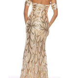 Voici la pièce idéale pour celles qui souhaitent briller avec naturel lors de leurs plus beaux événements. Notre robe longue dorée, aux motifs en sequins pétales façon éventail, allie raffinement et éclat subtil.